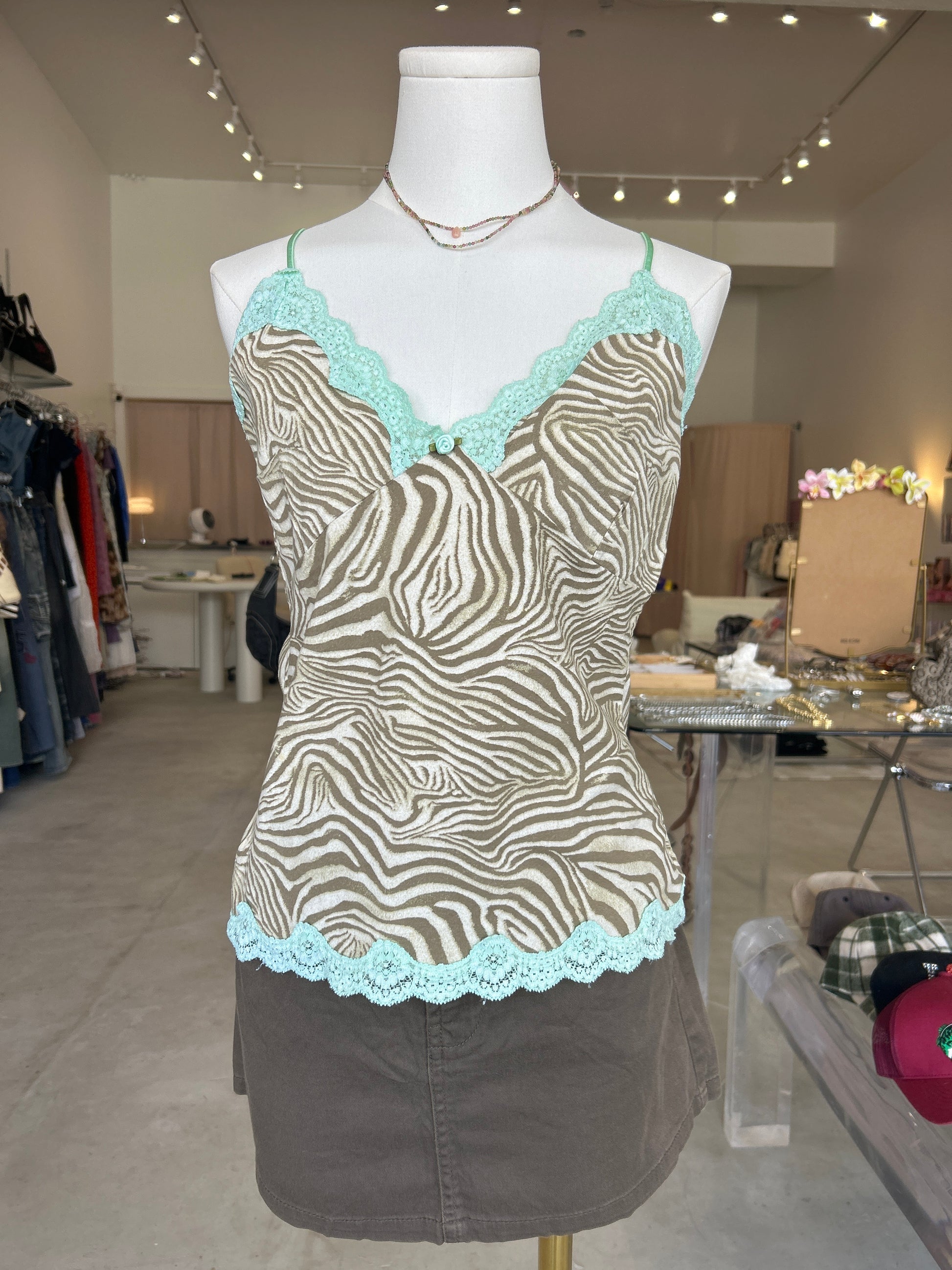 Muse Brown & Beige Zebra Print with Lace Trim Cami Top